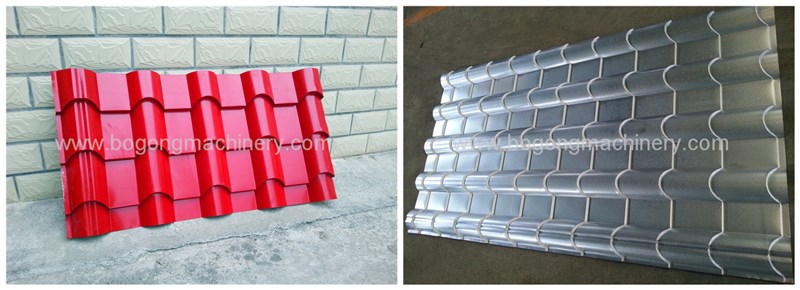 This Pre-painted Steel / Galvanized Steel Step Tile Roof Roll Forming Machine design is with four pinches, 790mm covered width and the raw material width is 1000mm. Whole roof tile surface is smooth and the two connect edges are flat also.