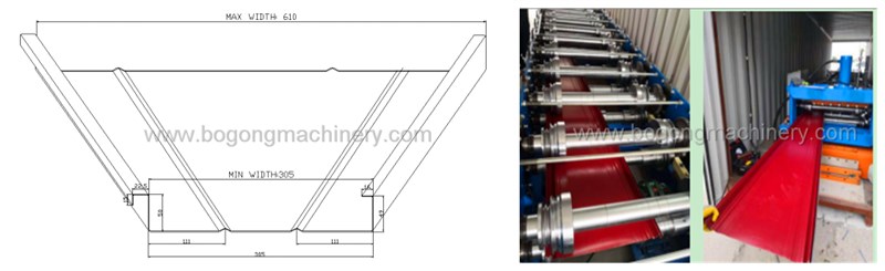 This tapered aluminum standing seam roof roll forming machine both can produce straight type standing seam roof and tapered standing seam roof, all the sizes can be changed by operating as below: